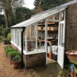 The above 10ft x 16ft lean-to greenhouse has 16″ wide panes of glass, aluminium capping and painted white all (manufatured from Accoya) for a cost of £13,675 delivered and installed in Elgin, Scotland (Unpainted Cedar cost – £9922)