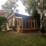 13ft x 33ft Bespoke greenhouse lean to – approx cost £20,736 inc vat. Stained Holly Green and fitted with black pvc guttering. 6ft6 Eaves with doors in the longsides.